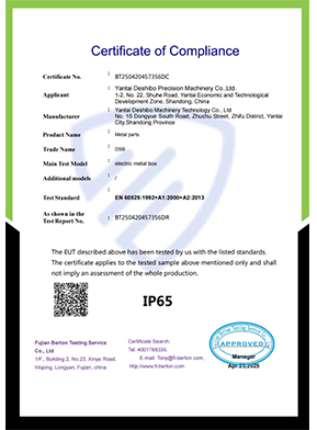 Yantai Deshibo Precision Metal Products Co.,Ltd is mianly specialized in sheet metal fabrication and CNC machining. Yantai DSB main fields are custom fabrication services, such as custom complete machines, aluminium parts, metal parts, laser cutting parts,stamping parts,control box, meter box,OEM metal box,heavy duty steel bracket,etc. for surface treatment,we have our own powder coating line,and outsourced hot dip galvanizing,cold galvanizing,chrome plating &anodizing.